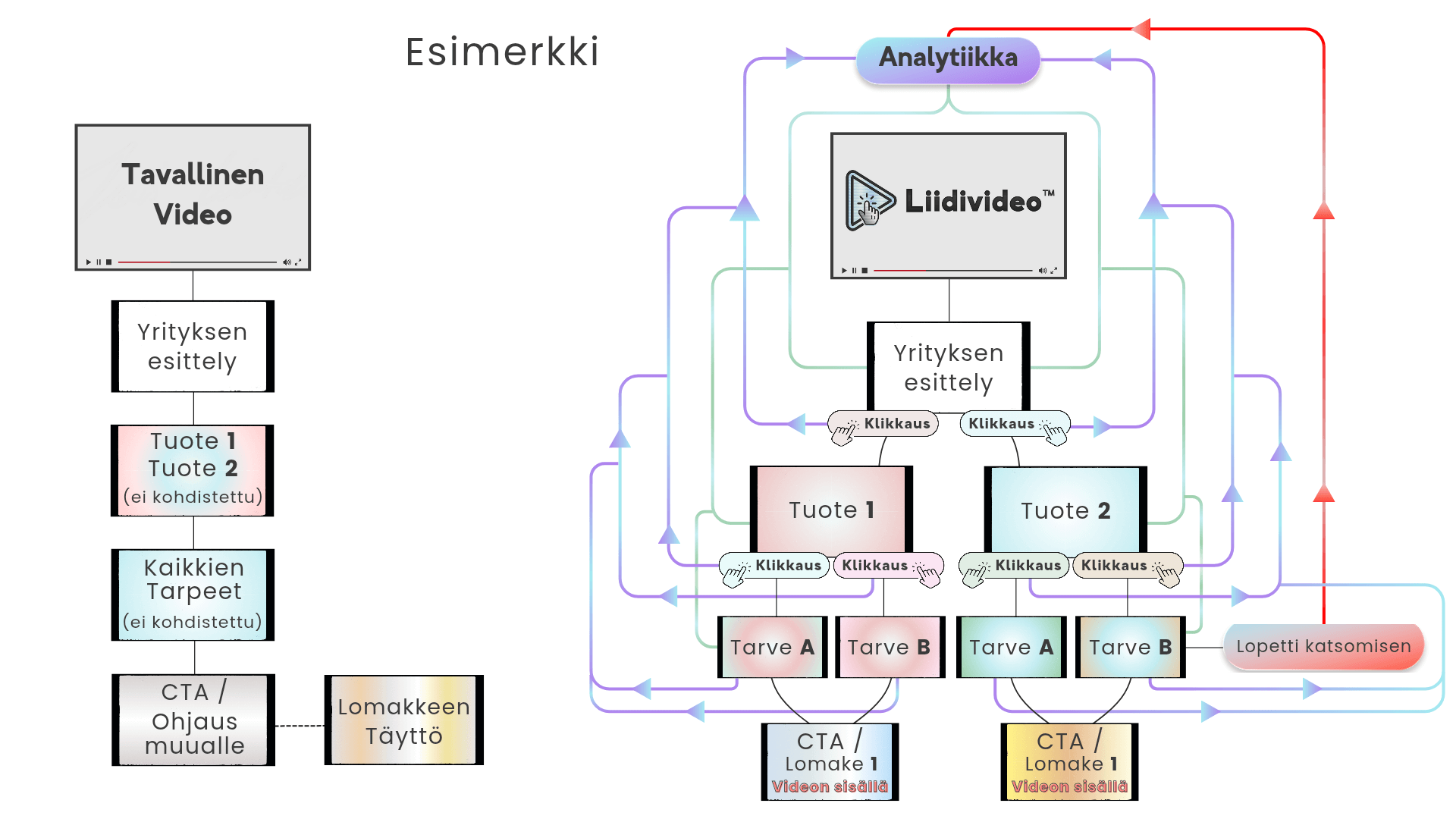 Hän valitsee, klikkaa ja jättää tietonsa suoraan videoon tai siirtyy ostamaan hänelle oikeasti relevantilta sivulta.